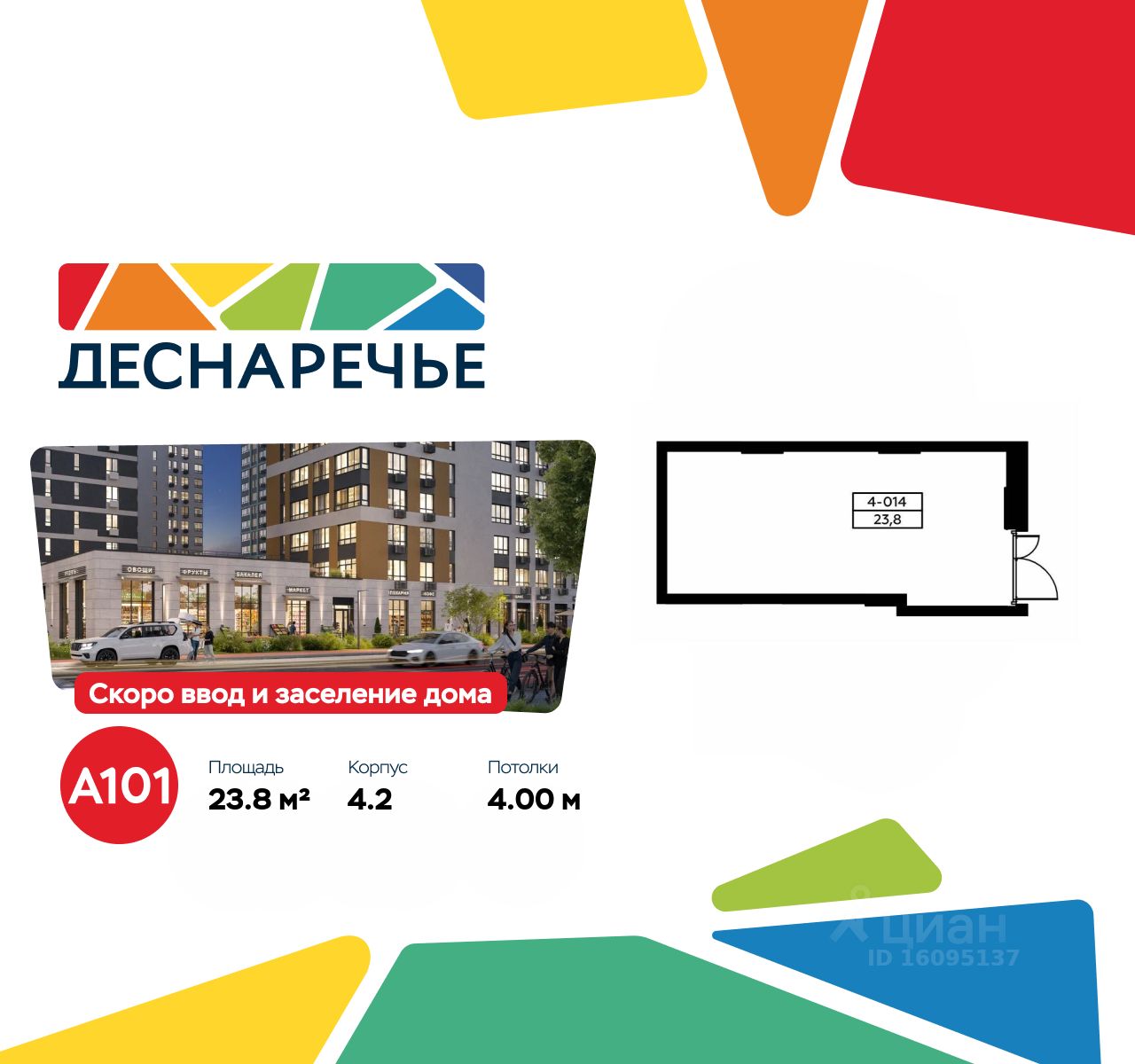 Сдается помещение площадью 23.80. на 1-м этаже ЖК "Деснаречье". Помещение находится в строящемся корпусе, срок сдачи IV квартал 2025 г.