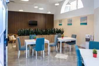 Рабочие места и пространство смарт-офисов укомплектованы для комфортной и продолжительной работы. В перерывах от работы резиденты и арендаторы коворкинга беспрепятственно могут посещать зоны кофе-брейк и зоны отдыха.