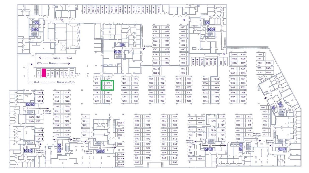 Сдаётся парко место 1212 на -1 этаже отапливаемого и охраняемого комплекса. Место находиться рядом со входом в корпус 2 и корпус 4.