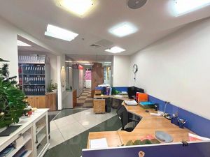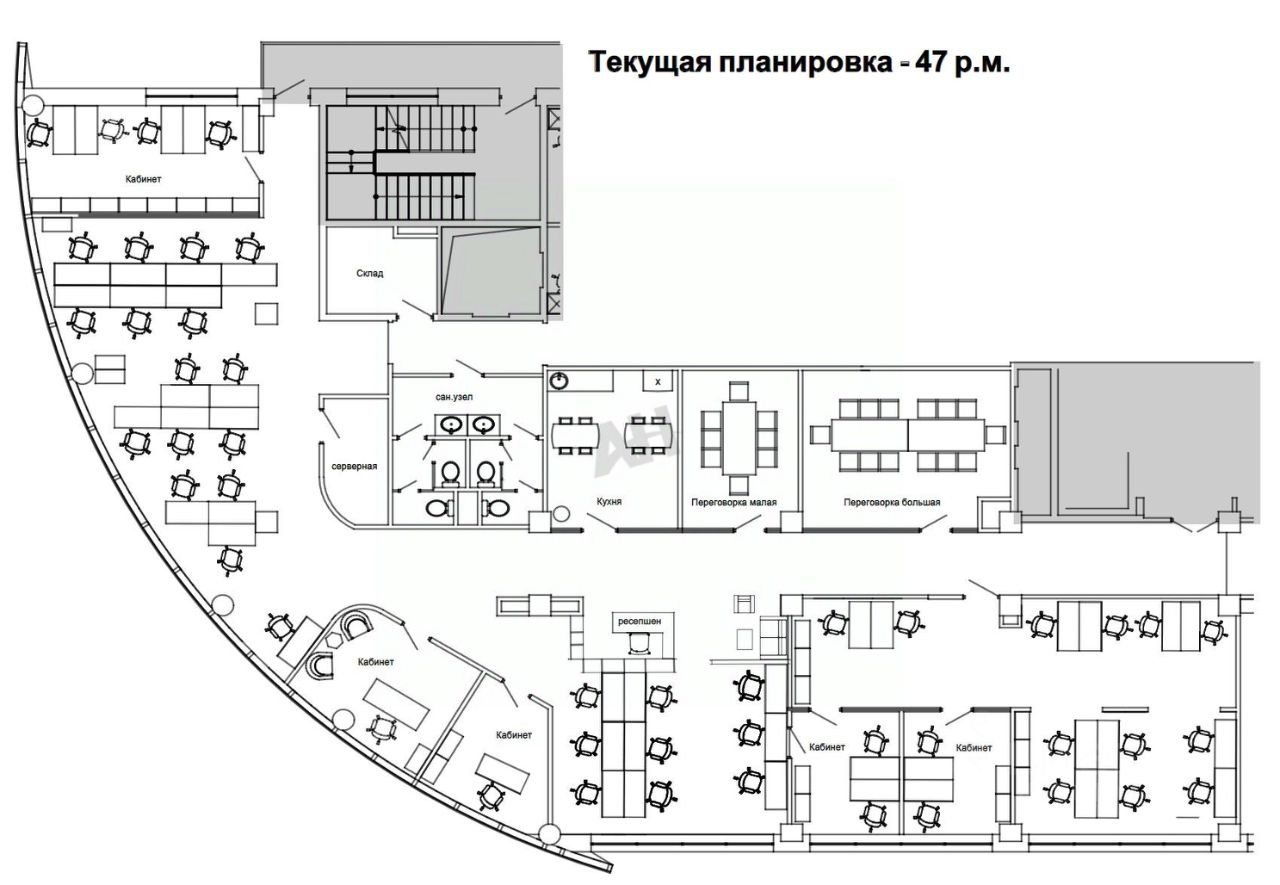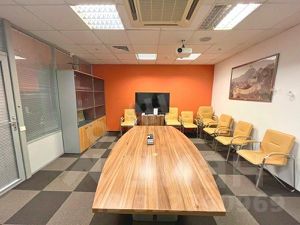 Помещение смешанной планировки, рассчитан на 46 рабочих мест, возможно увеличение до 54 рабочих мест. Ресепшен, зона опен спейс, 5 отдельных кабинетов, переговорные комнаты, серверная, склад, кухня, свои санузлы в блоке.