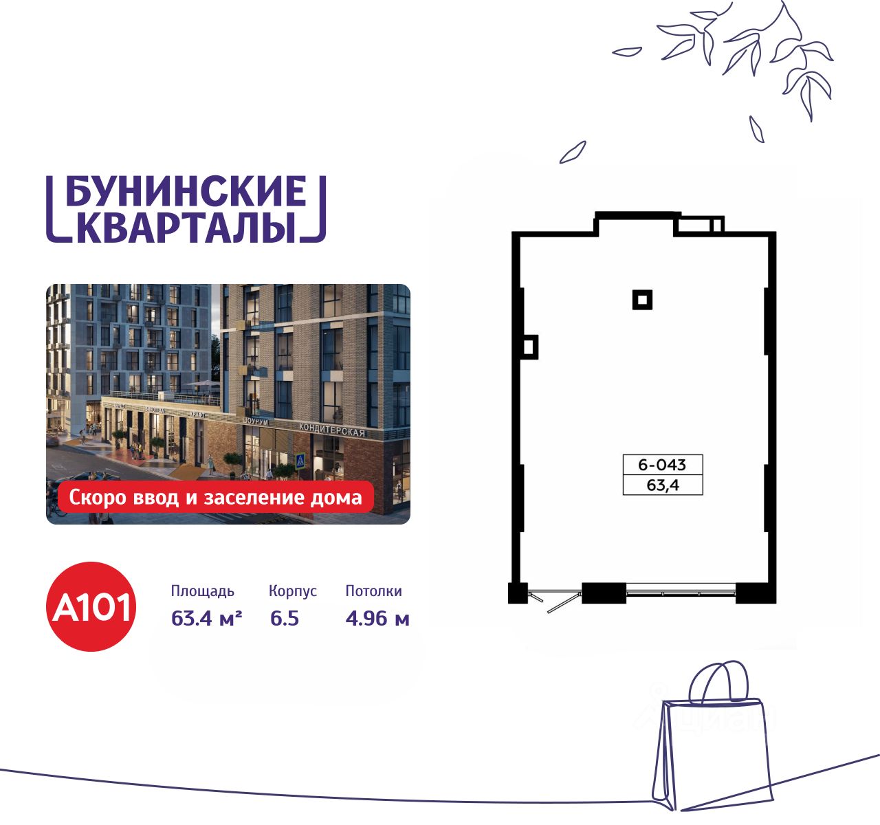 Сдается помещение площадью 63.40. на 1-м этаже ЖК "Бунинские кварталы".