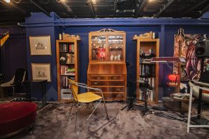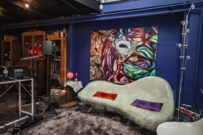 Интерьер офиса выполнен в стиле эклектики с необычными предметами декора и освещением.