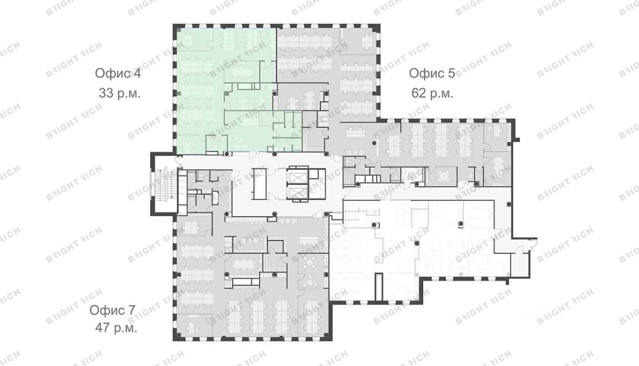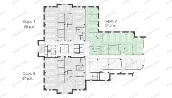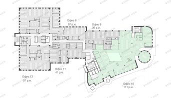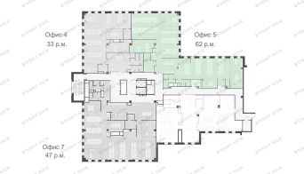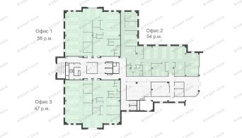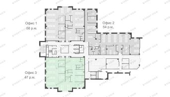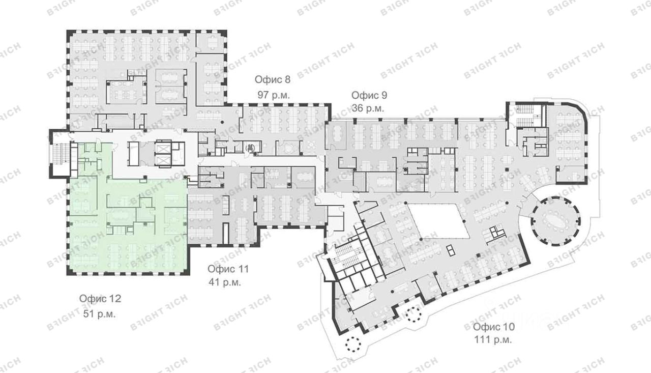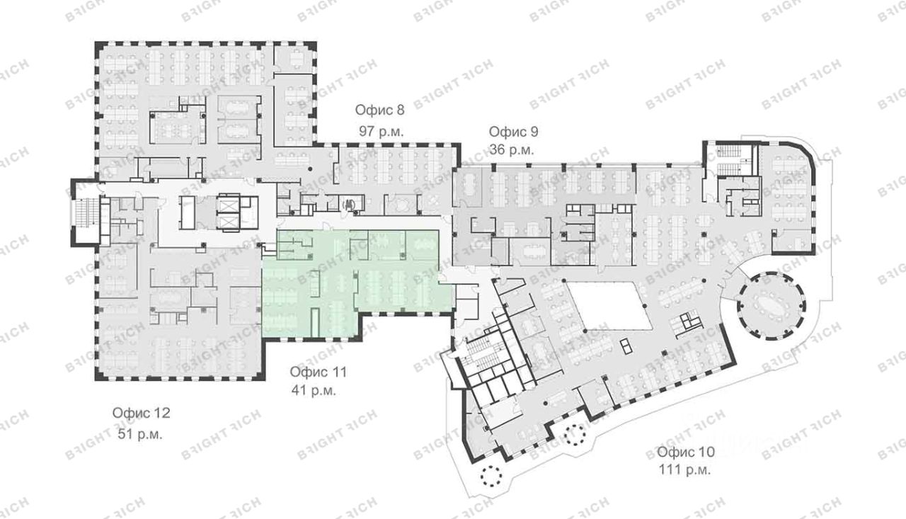 • Планировка: open space, кабинеты, переговорные, кухни, лаундж-зоны, с/у