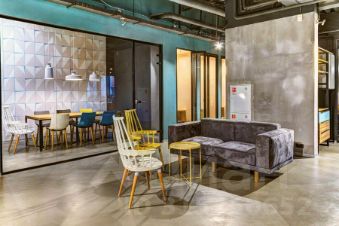 Аренда сервисного офиса в Workki на Калужской. Собственный этаж с мебелью, ярким дизайном, вторым уровнем для кабинетов руководства и двумя террасами.