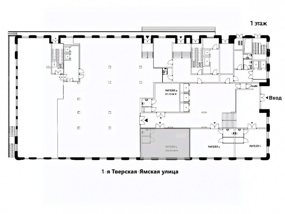 1-й этаж в гостиничном комплексе. Общая площадь 102.6 м², прямоугольной формы. Отдельный вход через лобби. На входе встречает и открывает дверь швейцар. Состояние помещения shell&core. Витринное остекление на Тверскую улицу. Эл. мощность 40 кВт. с возможностью увеличения. Все центральные коммуникации. Система вентиляции -.имеется вент. канал.