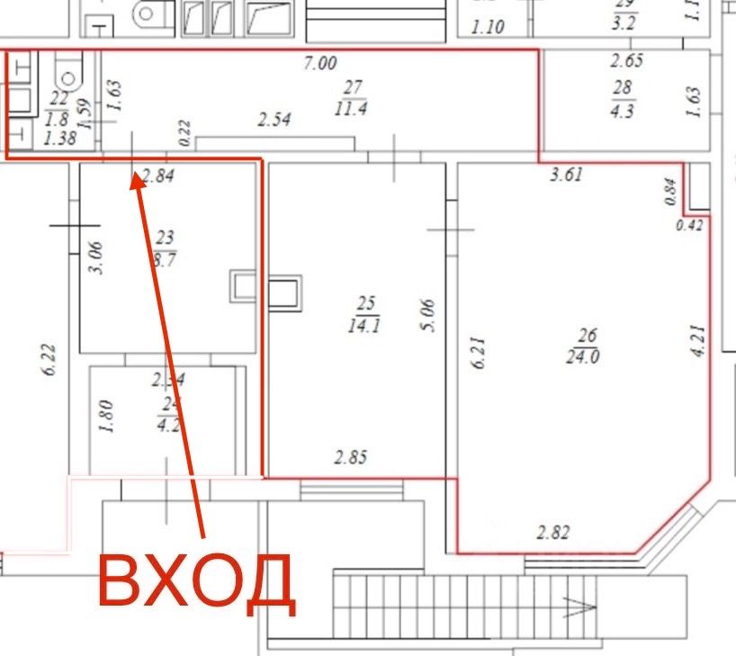 Вход в помещение с улицы, хорошо просматривается, есть возможность размещения рекламной вывески на фасаде. Помещение состоит из: входной тамбур, зона ожидания/ресепшен, коридор, 2 кабинета, 1 санузел. В каждый кабинет подведена вода и канализационный слив.