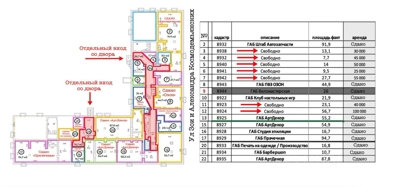 Часть помещений уже сданы под: "ОЗОН", "Прачечная", "Ремонт велосипедов", "Печать на футболках", "Студия эпиляции", "Барбершоп", "Автозапчасти", "Декор".