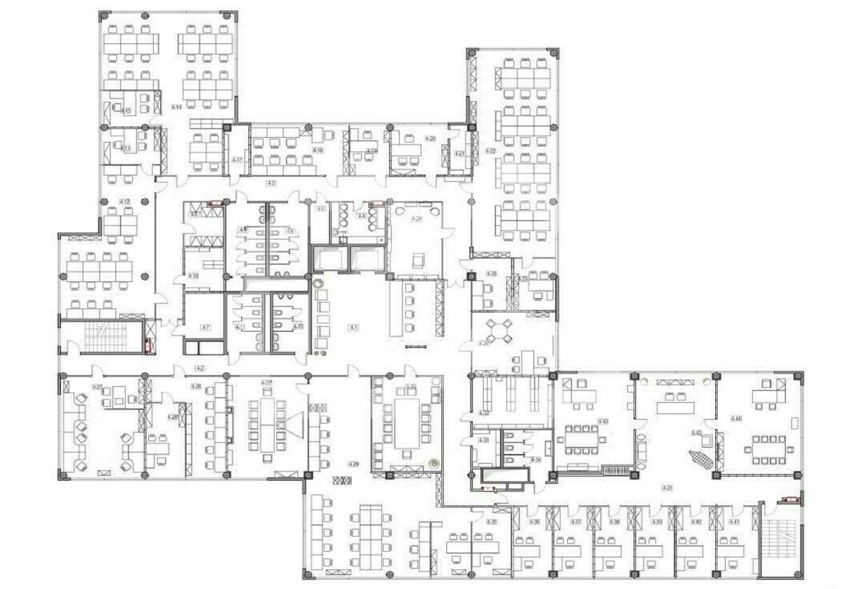- Планировка смешанная: несколько переговорных, кабинетов и open space