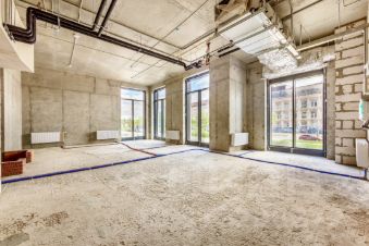 Первая линия домов. Отдельный автономный вход с улицы. Панорамное остекление витражными окнами в пол. Высокие потолки 3,5 метра. Планировка помещения зальная, помещение свободной планировки. Есть выделенная зона под складские нужды и/или комнату для персонала со своим стояком сан узла.
