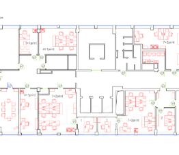 Ресепшн, переговорная, кабинеты, кухня и санузлы.