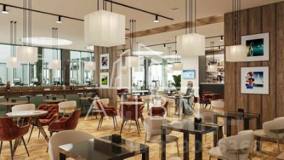 В холле расположено декоративное оливковое дерево, зонирующее пространство на рецепцию и кафе.