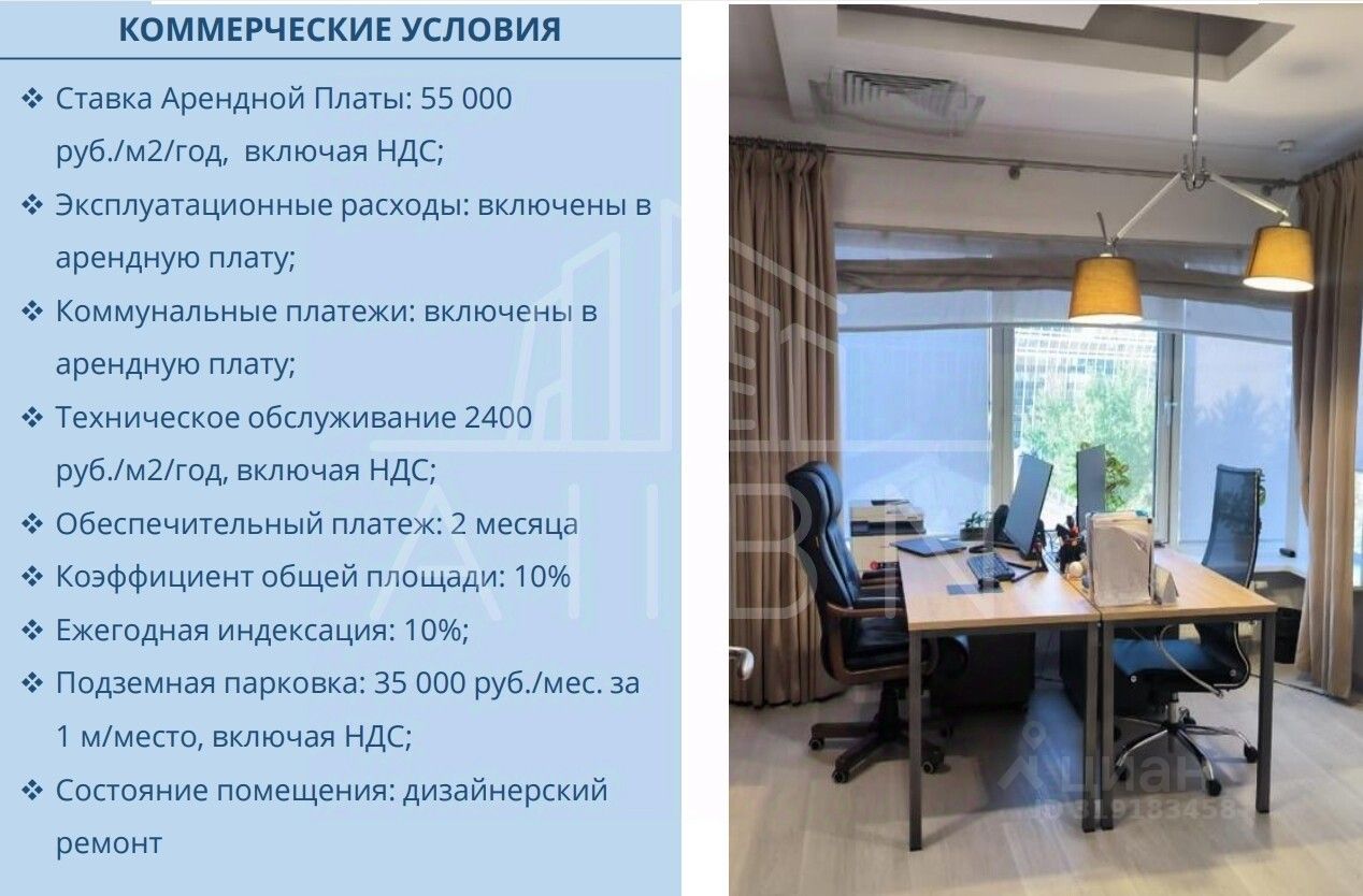 -Ставка Арендной Платы включая НДС; - Эксплуатационные расходы: включены в арендную плату; - Коммунальные платежи: включены в арендную плату; - Техническое обслуживание 2400 руб./м2/год, включая НДС; - Обеспечительный платеж: 2 месяца - Коэффициент общей площади: 10% - Ежегодная индексация: 10%; - Подземная парковка: 35 000 руб./мес. за 1 м/место, включая НДС; - Состояние помещения: дизайнерский ремонт