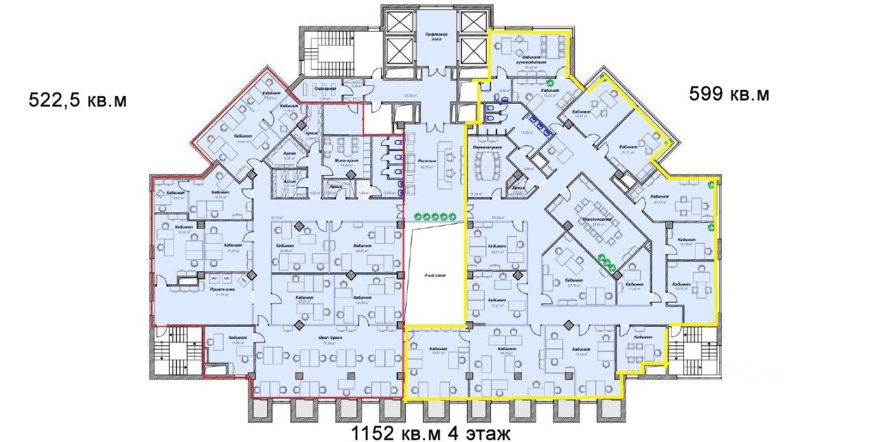 Планировка смешанная: кабинет руководителя, зона open-space, несколько кабинетов, переговорная, кухня, серверная, санузел, свои санузлы.