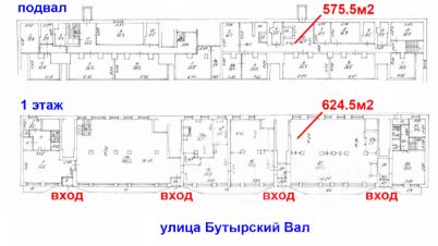 Помещение в два уровня: 1-й этаж - 624.5 м² и подвал - 575.5 м².