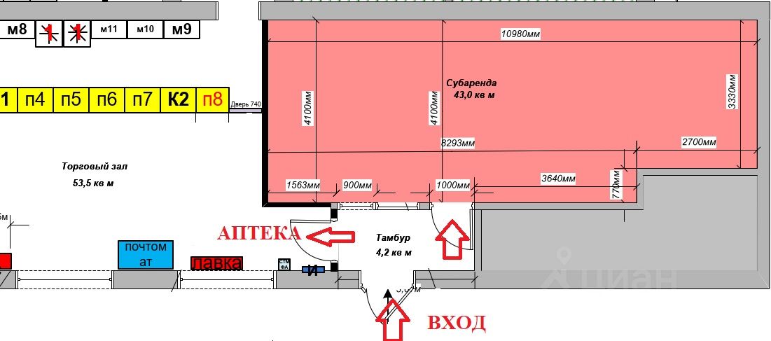 Сдается помещение площадью 43 кв.м. (свободно 28,3 кв.м.+14,7 кв.м. добавим от аптеки). Вход из тамбура на 2 двери совместно с аптекой. Стены перенесем после нахождения арендатора. Рекламное место на фасаде предоставляется. В арендную плату все включено. Рассмотрим все предложения, кроме общепита. Звонки принимаются в рабочие дни с пн-пт с 9.15 до 18.00.