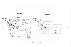 - Первый этаж - 177,5 м2, подвала - 95,6 м2.