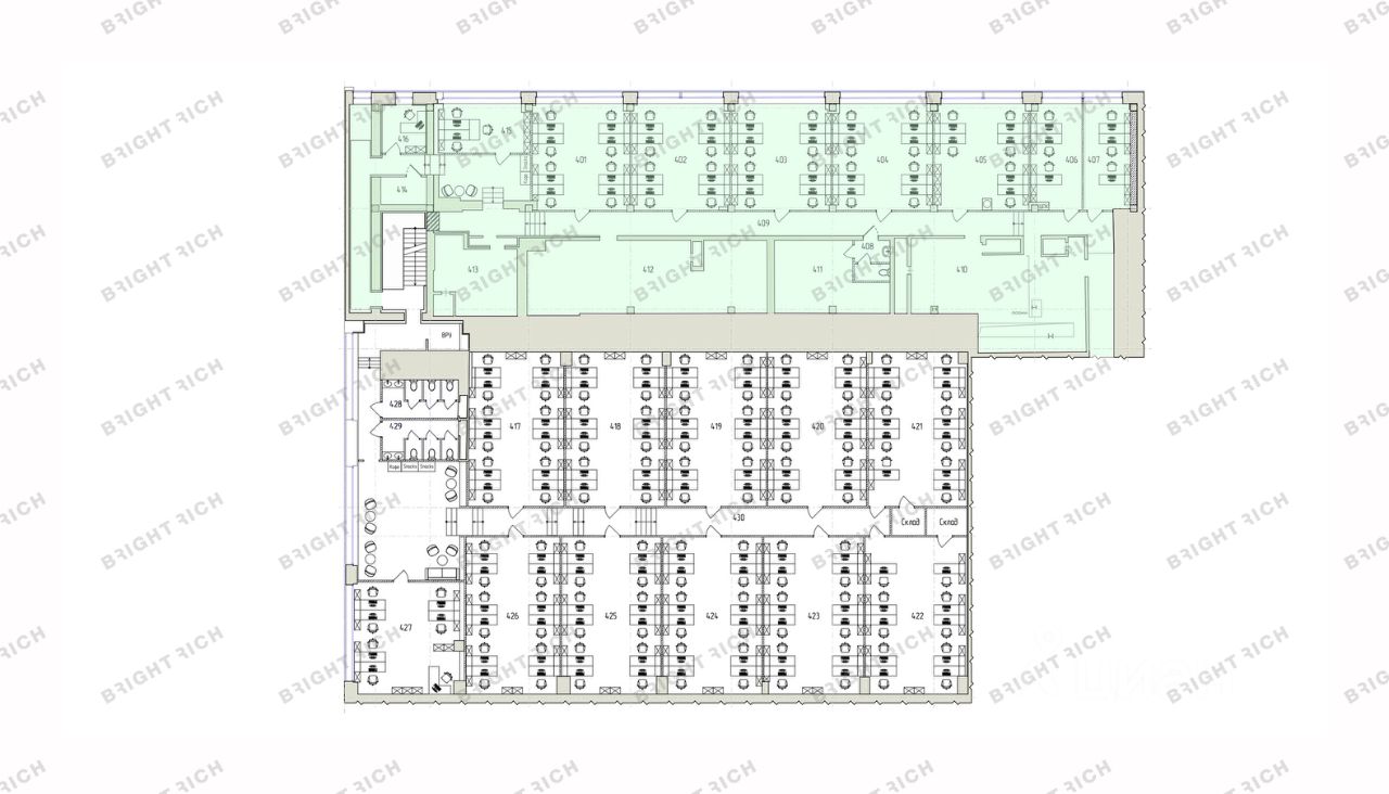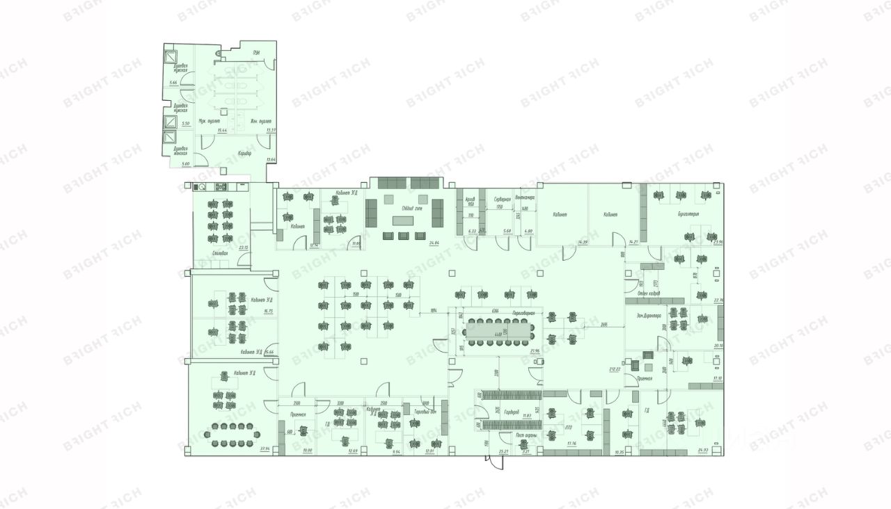 • смешанная планировка — open space; кабинеты, в том числе кабинеты для руководителей с приемными; ресепшен, кухня с мокрой точкой, архив, серверная, гардероб, с/у, душевые, лаундж-зона;