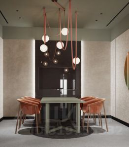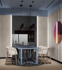 В блоке предусмотрены гардеробная, переговорные комнаты, зона ресепшн и отдыха, оборудованная кухня.