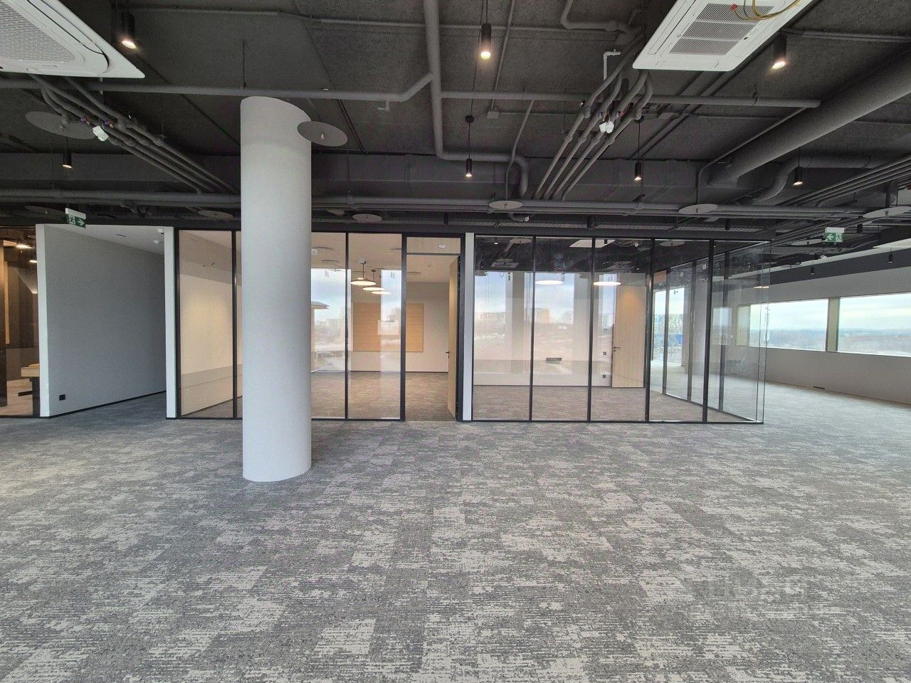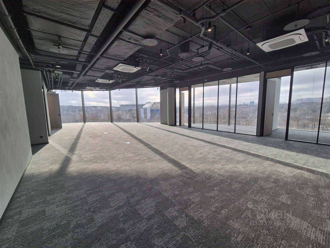 Описание помещения: Остекление от пола до потолка. Шаг колонн 9 на 10,5 метров. Фальшпол 200 мм. Высота потолков первый этаж 4,8 метра, на остальных этажах 3,9 метра.