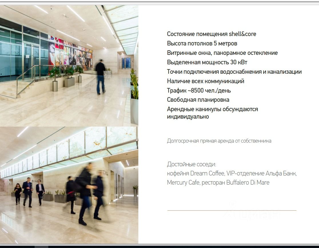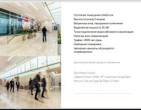 Предлагается в аренду помещение в состоянии Shell & Core. Помещение под ритейл/салон красоты/шоурум (не кофе, не еда). Высота потолков - 5 метров. Витринные окна, панорамное остекление. Выделенная мощность 30 кВт. Точки подключения водоснабжения и канализации. Наличие всех коммуникаций. Трафик ~8500 чел./день. Свободная планировка. Арендные каникулы обсуждаются индивидуально. Достойные соседи: кофейня Dream Coffee, VIP-отделение Альфа Банк, Mercury Cafe, ресторан Buf falero Di Mare. Договор аренды от трёх лет. Можно разделить на 100 кв.м и 45 кв. м.