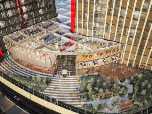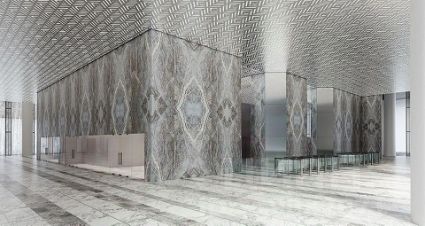 Они имеют направленные внутрь либо скошенные углы, подчеркнутые красным фриттованным стеклом. Фасады отделаны вертикальными перфорированными металлическими панелями, за которыми находятся открываемые окна - нержавеющая сталь натурального цвета на солнечной стороне и темно-серая нержавеющая сталь на фасадах теневой стороны. Особенностью башен являются открытые небесные террасы.