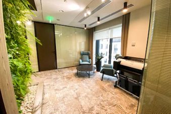 Видовой офис смешанной планировки, с комнатой отдыха руководителя, переговорными, центральной стойкой ресепшен, мебелью. Офис расположен на 7 и 8 этажах. Дизайнерская входная группа. Многоуровневый подземный паркинг.