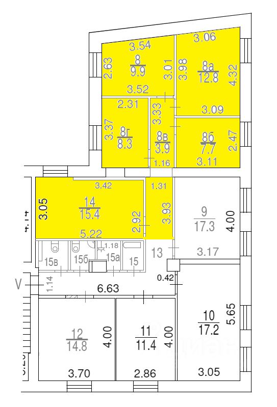 Помещение располагается на 3 этаже нежилого здания (на плане БТИ выделено желтым цветом).