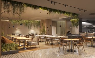 Площадь - 369,40 кв. м, собственный вход с первого этажа, отдельная вытяжка для устройства кухни полного цикла, шесть мокрых точек, зона погрузки и разгрузки, место для рекламной вывески. Помещение расположено на -1 этаже, предусмотрен отдельный вход с улицы, а для сотрудников делового центра организован лифт прямо в холл кафе. Высота потолка - 2,8-4,3 м. Предусмотрена электрическая мощность 84 кВт.
