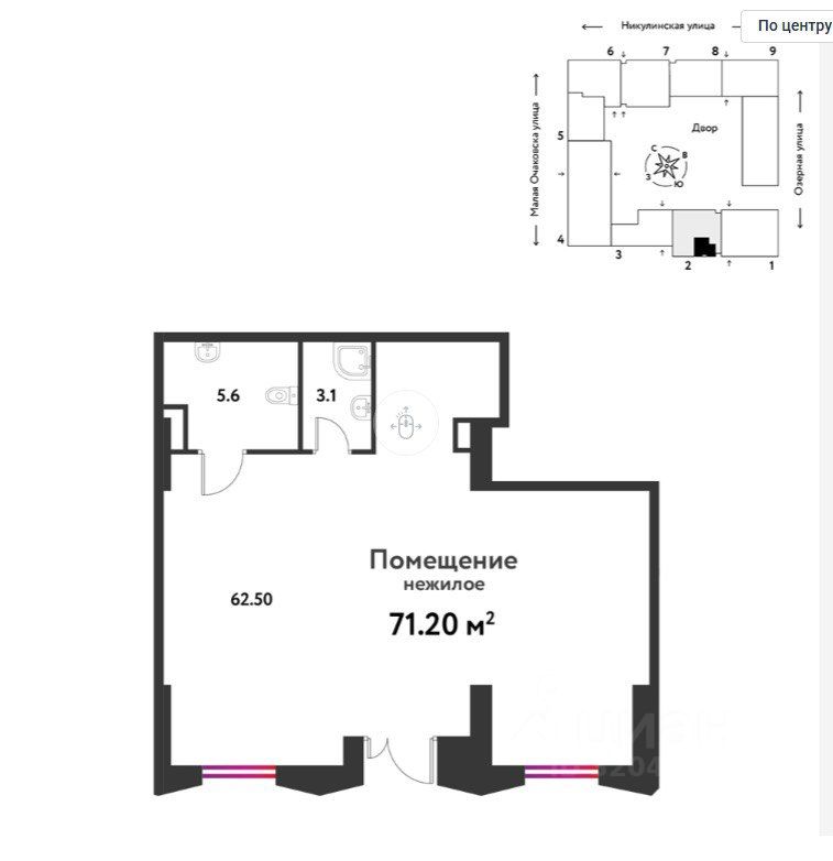 Общая площадь 71,2 кв.м., планировка правильной формы без капитальных стен и колонн. Помещение находится в доме Байкал, срок сдачи 2 кв. 2026 года. Витринные большие окна, высота потолка 4.5 метра. Входная группа находится вдоль пешеходной тропы самой короткой к уже сданному в эксплуатацию ЖК Мичуринский Парк от ПИК. Помещение также хорошо видно с Малой Очаковской улицы. Выделенные места под вывеску и рекламу.