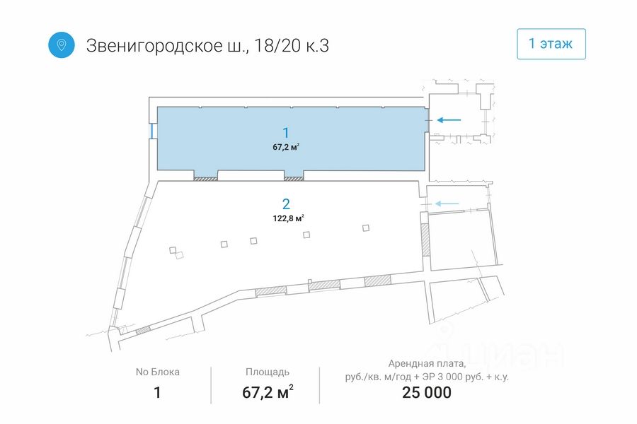Арендный платеж - 25 000 рублей кв.м/год, вкл. НДС 20% + ЭР 3 000 рублей + КУ.