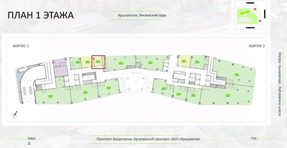 - Высокий инвестиционный потенциал благодаря выгодному соседству с ключевыми транспортными узлами: 1 минута до Рублевского шоссе, 5 минут до Кутузовского проспекта, 15 минут до Москва-Сити и Нового Арбата, 3 минуты до метро (БКЛ и МЦД-1) Кунцевская;