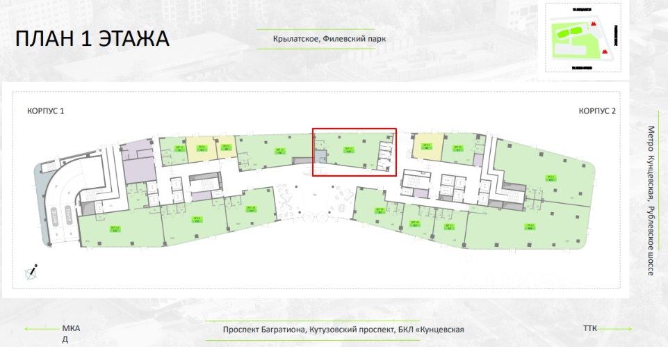 - Высокий инвестиционный потенциал благодаря выгодному соседству с ключевыми транспортными узлами: 1 минута до Рублевского шоссе, 5 минут до Кутузовского проспекта, 15 минут до Москва-Сити и Нового Арбата, 3 минуты до метро (БКЛ и МЦД-1) Кунцевская;