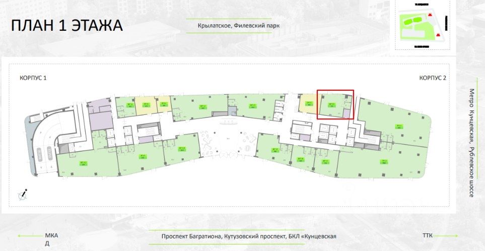 - Высокий инвестиционный потенциал благодаря выгодному соседству с ключевыми транспортными узлами: 1 минута до Рублевского шоссе, 5 минут до Кутузовского проспекта, 15 минут до Москва-Сити и Нового Арбата, 3 минуты до метро (БКЛ и МЦД-1) Кунцевская;