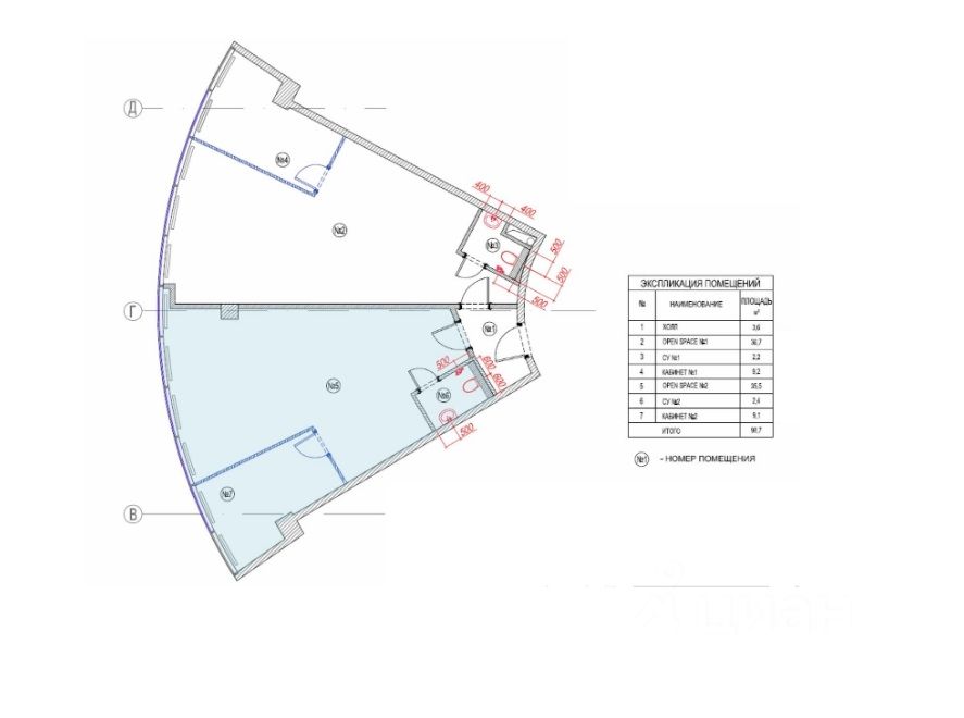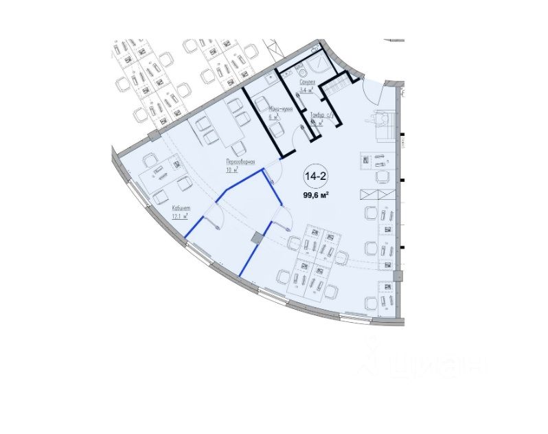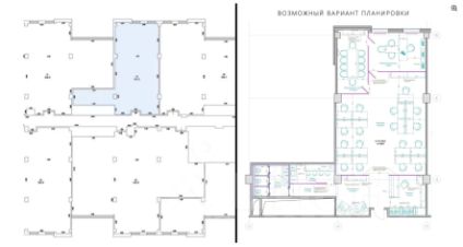 Планировка кабинетная, открытая или смешанная, некоторые офисы имеют свой санузел, некоторые офисы без соседей и т.д.
