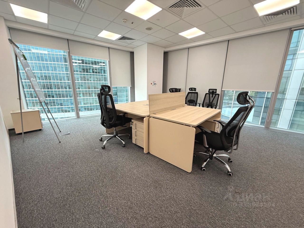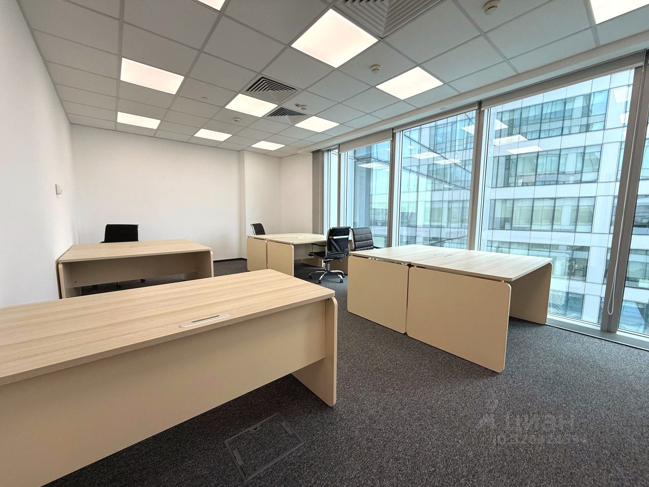 Современный офис с качественной отделкой, панорамным остеклением и мебелью.