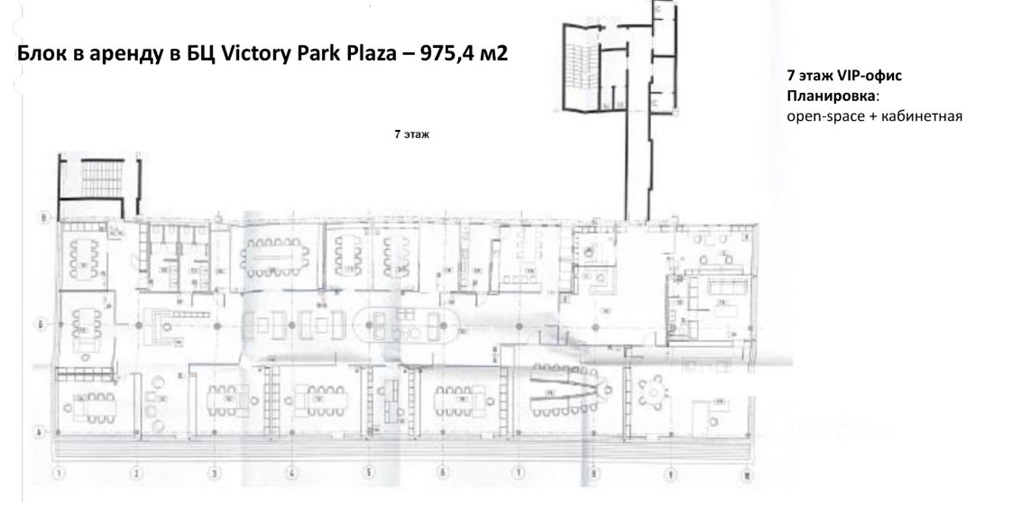 Арт. 85929622. Предлагается к длительной аренде офисное помещение в БЦ "Victory Park Plaza" - эффектное разноуровневое здание офисного центра с панорамным остеклением фасадов и дизайнерскими интерьерами, 2014 года постройки. Назначение помещения: офис В+. Площадь 975,4 кв.м. VIP - офис с зоной для руководства. Офис с современным ремонтом. Потолки более 5 метров. Собственный балкон в блоке. Преимущества: пешая доступноть от метро и МЦД, собственный паркинг, развитая инфраструктура здания (столовая, кофейни, минимаркет), шикарные виды с 7 этажа.