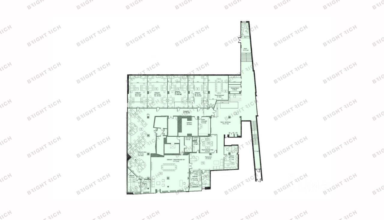 • Планировка: open space, кабинеты, переговорные, кухня, серверная, ресепшн, с/у