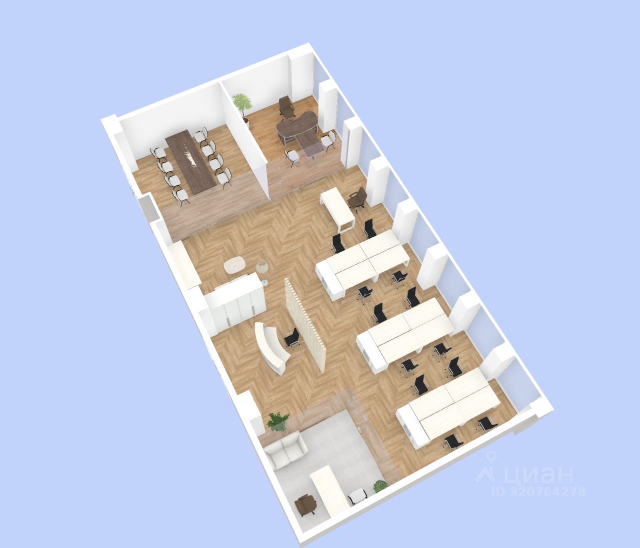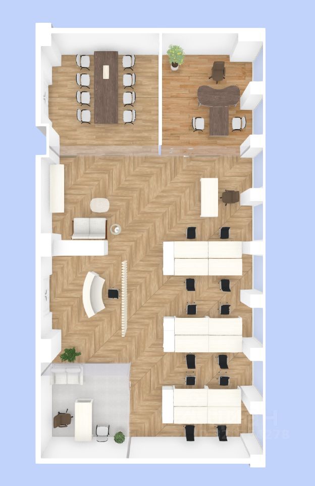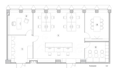 Вы получаете чистую бетонную коробку и выполняете ремонт по собственному или нашему дизайн-проекту (оптимальная планировка до 20 сотрудников). На картинках указан один из вариантов рассадки.