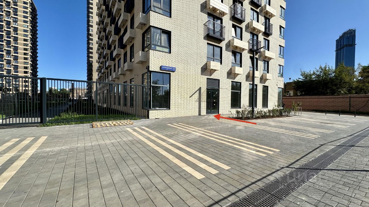 Вход в помещение с общедоступного пешеходного променада, отделенного от проезжей части широкой полосой благоустройства. В непосредственной близости вход во двор ЖК. На противоположной стороне дороги городская парковка.