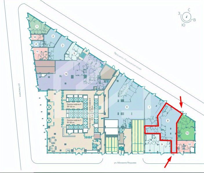 1006831 . Предлагаем помещение свободного назначения формата Street Retail, площадью 364 кв. м., расположенное на первом этаже в бизнес-центре класса Prime "Север". Стилобатная часть здания.