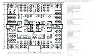 Высота потолков варьируется от 3,5 м до 4,25 м. Инженерные системы запроектированы под рассадку 1 человек на 6 м2. Типовая нагрузка на перекрытия 540 кг/кв.м. Нагрузка на перекрытия в зоне усиления 720 кг/кв.м. На фотографиях помещений представлены проектные решения оформления следующих зон: ресепшен, переговорной и open-space. На схеме корпус указан под номером 1. Юридический адрес предоставляется. В здании оборудован многоуровневый паркинг.