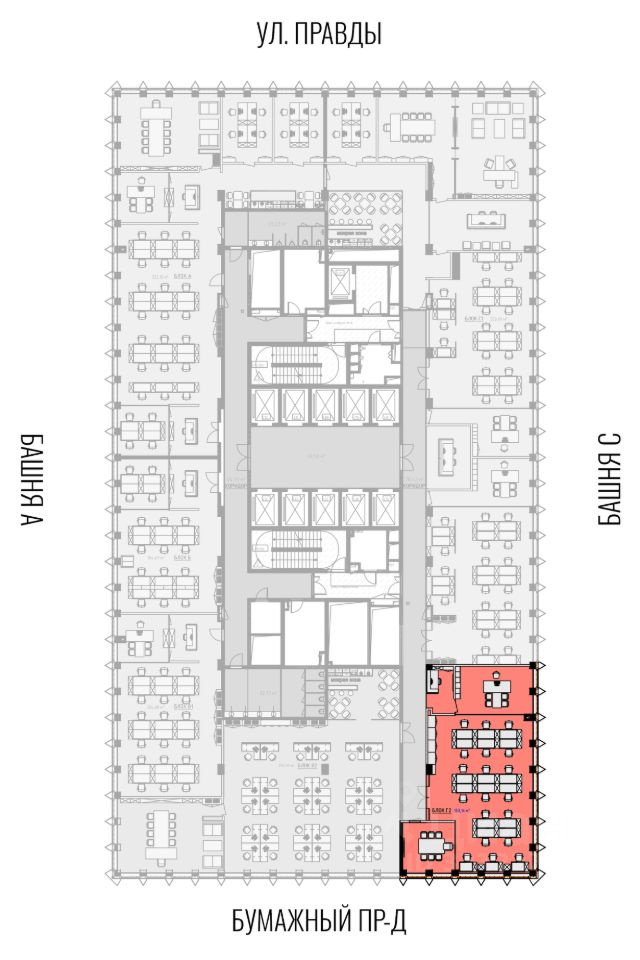 Угловое помещение свободно и готово к Вашим идеям. Из панорамных окон благодаря высокому этажу открываются роскошные виды. Окна выходят в сторону Бумажного проезда и Башни С. Возможны различные варианты планировки помещения как под свои нужды, так и для сдачи в субаренду. Есть мокрая точка.