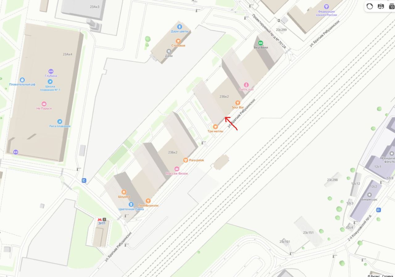 Помещение с отдельным входом и витринными окнами на первом этаже жилого комплекса Парк Легенд, сейчас сидит арендатор - пиццерия. Соседи: магазин одежды, копировальный центр, пункт выдачи Озон. Комплекс полностью заселен. Вход в метро ЗИЛ в 150 метрах от входа в помещение.