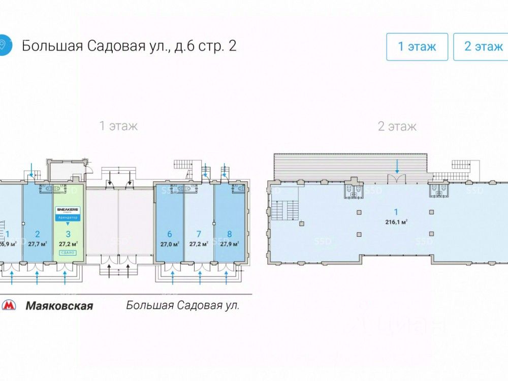 Предлагается в аренду помещение торгового или свободного назначения (ПСН) площадью 243 кв.м 2ой этаж нежилого здания, расположенного по адресу: г. Москва, Большая Садовая ул., д. 6, стр. 2, ЦАО, район Пресненский. Шаговая доступность от ст. метро "Маяковская" - 3 минуты пешком. Вход с Садового кольца. Высокий рекламный потенциал и место для размещения вывески. Отличная пешеходная и транспортная доступность. Сверхинтенсивный пешеходный и автомобильный трафик. Отлично подойдёт под любой вид деятельности - торговое помещение, магазин, ресторан, кафе, аптека, салон красоты, банк, офис продаж, кофейня и др.