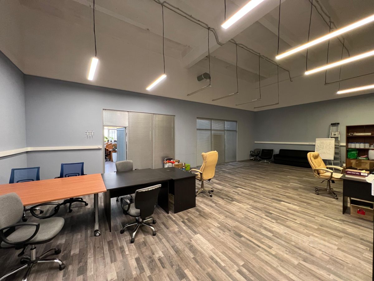 Помещение с окнами (166.1 кв. м + 79.1 кв. м + 12.7 кв. м металлический каркас со стеклом) выполнено в формате open-space. Стены отделаны гипсокартоном, частично оклеены обоями и окрашены водоэмульсионной краской в зелёный и серо-голубой цвета, местами использована декоративная штукатурка "Короед" бежевого оттенка. Межкомнатная перегородка выполнена частично из стекла в ПВХ-раме. Пол покрыт линолеумом, потолок представляет собой железобетонное перекрытие, окрашенное белой водоэмульсионной краской. Высота потолка 5 метров.