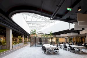 В настоящее время мы стремимся воссоздать и усилить уникальную атмосферу, которая царила в этом офисе ранее. Сейчас мы активно занимаемся озеленением общественных пространств и обновлением ключевых зон. Разрабатываем проекты рассадок сотрудников, устанавливаем дизайнерское освещение, создаем двухэтажные и индивидуальные переговорные комнаты, кофе поинты, столовые как для нашего коллектива, так и для арендаторов.