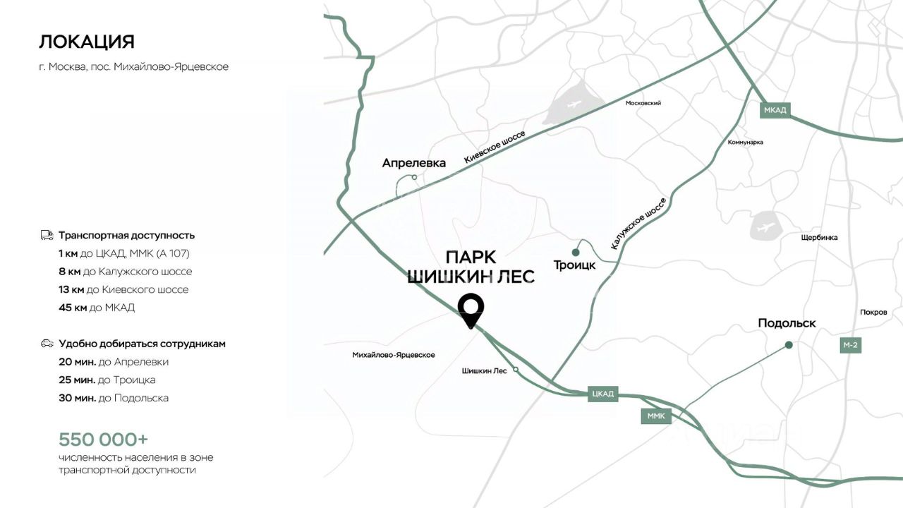 Расположение: г Москва, поселение Михайлово-Ярцевское, поселок Шишкин Лес, (Юго-Запад, - 33 км от МКАД - 2 км от ЦКАД). федеральные трассы Калужское шоссе, Киевское шоссе!