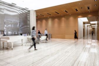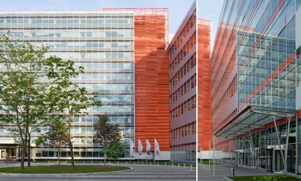 Инфраструктура здания: большая столовая на 400 посадочных мест, кафе, ресторан, фитнес-клуб, банкоматы.