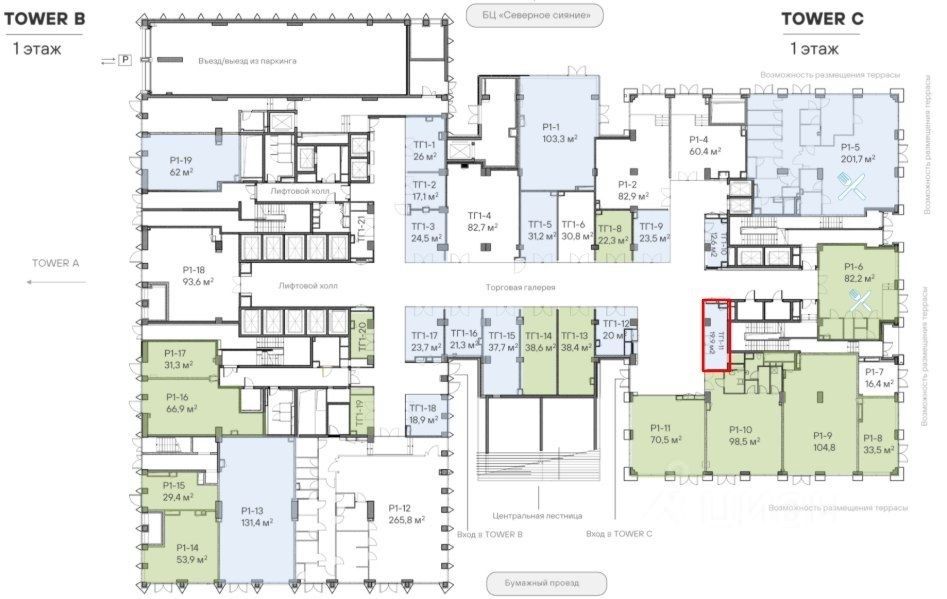 - Развитая инфраструктура: торговая галерея, офисные помещения, столовая для резидентов;