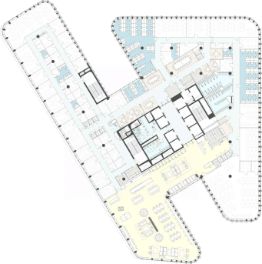 Данный блок имеет прекрасные видовые характеристики, благодаря панорамному остеклению с трех сторон. На поэтажном плане блок выделен голубым с закругленим фасадной лиинии.